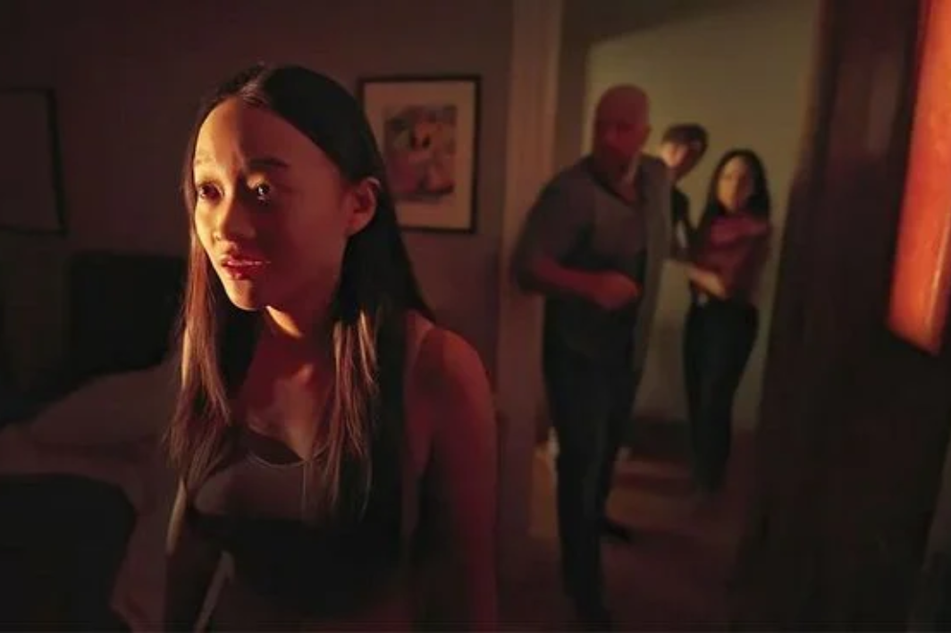 O elenco entrega atuações sólidas, mas para mim, Callina Liang se destaca como Chloe. Sua personagem é a única que realmente percebe a presença da entidade, e sua atuação transmite bem essa inquietação sutil. A forma como ela reage a essa sensação de ser observada adiciona uma camada extra de tensão ao filme.